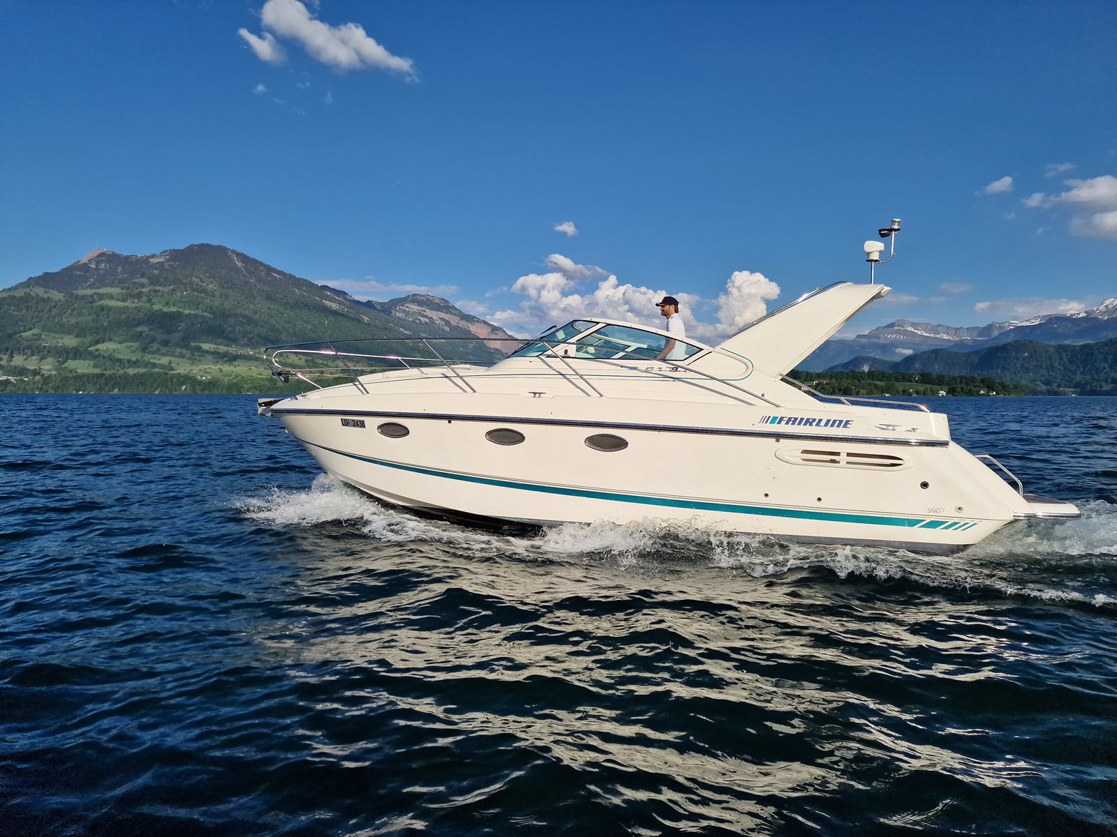 Unsere Fairline Targa 29 überzeugt mit 9 Metern Länge, 3.1 Metern Breite und einem kräftigen Motor mit 254 kW (345 PS) – ideal für stilvolle Entdeckungstouren auf dem Vierwaldstättersee.